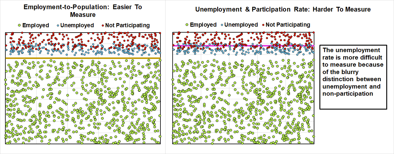 Rather than trying to divine whether someone is truly searching for employment or on the sidelines, it is so much cleaner to look at whether someone is employed or not employed. An age-adjusted employment-to-population ratio makes the analysis more straightforward.