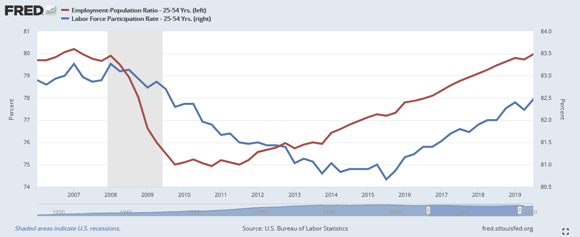 Looking at the prime-age employment-to-population ratio, the story is much simpler: the recovery and the expansion simply continued. And as it continued, more job growth came from those who were reporting to be out of the labor force (Tedeschi 2019).