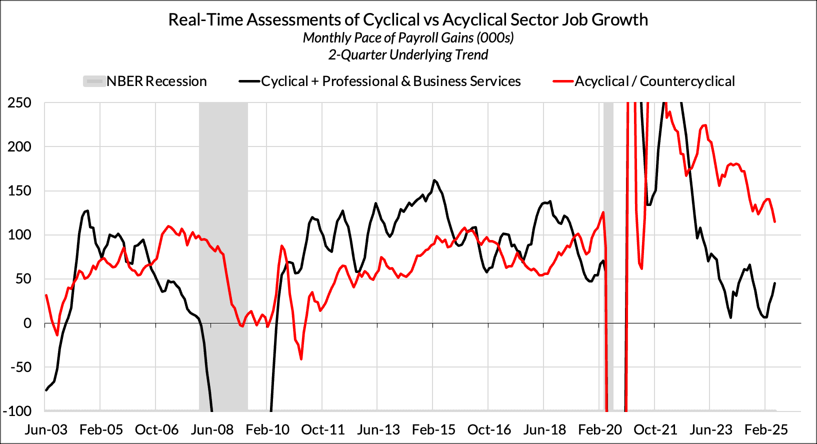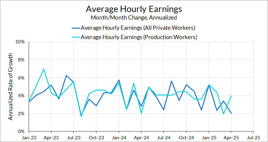 This month’s jobs data comes a month after “Liberation Day” and everyone, us included, are looking for signs that the effects of tariff policy will show up in the labor market. If you were expecting it to show up this month, it’s too early (remember, the surveys cover the pay period of April 12th—a mere 10 days after the initial tariff announcement). So far, pain from the tariffs has not shown up in any obvious way in the labor market data, and it may not for a few months—currently, our recession call is for one to start in the third quarter if we see one. Right now, businesses are saying they’re on pause while tariff policy gets sorted out, and that may also apply to layoffs as well.