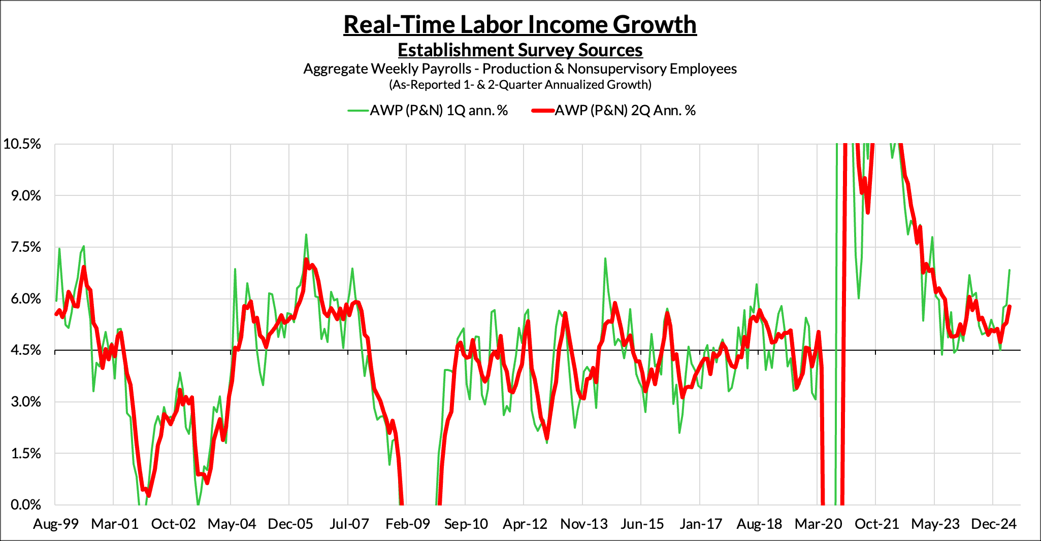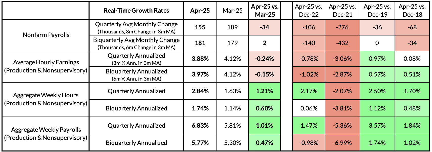 Turning to the establishment survey, the labor market through April 12th (the pay period the survey covers) also appeared mostly strong. Payroll growth was strong, even in the goods-producing and trade-related sectors one would expect to be hit hardest by tariffs. This may be a symptom of businesses front-running tariffs; in any case, it is too early for labor market damage to show up in those sectors.