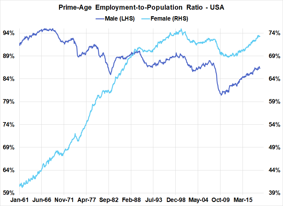 - Prime-age EPOP would have been a less helpful measure during much of the 1960s, 70s, and 80s due to the systematic rise in female employment.