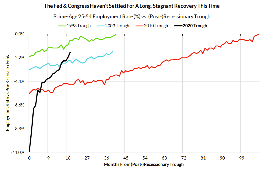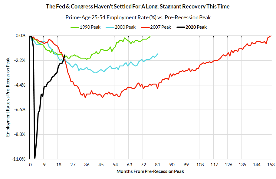 To understand the pandemic recovery, we have to put it into its proper perspective. Current fiscal and monetary policymakers have clearly outdone their predecessors and have shattered past excuses for why Americans should settle for a shallow and sluggish employment recovery. The Fed's commitment to avoiding interest rate policy tightening until maximum employment is achieved has played a pivotal role in creating financial conditions sufficiently supportive to achieve this goal.