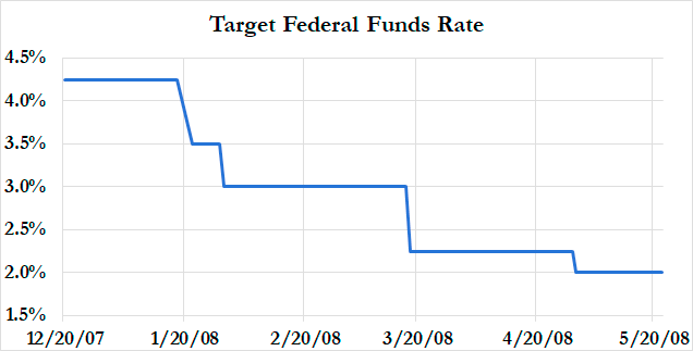 The 2008 experience began with a series of accommodative measures. The Federal Open Market Committee (FOMC) first lowered its target for the federal funds rate from 4.25% to 3.00%. Chair Bernanke also successfully advocated for Congress and the White House to pass the Economic Stimulus Act of 2008. In March, the Fed short-circuited financial panic by questionably subsidizing JP Morgan’s acquisition of the troubled Bear Stearns. By the April FOMC meeting, the federal funds rate target had been lowered to 2% and financial markets were showing signs of stabilization.
