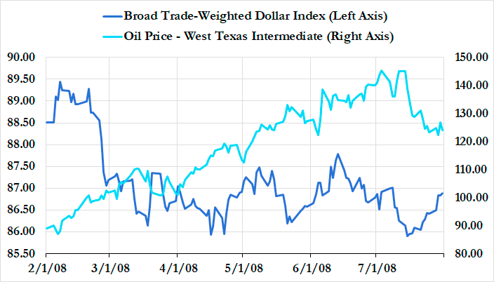 While the economy was still sinking further into recession, financial markets and FOMC members were more concerned that the economy was about to repeat the high inflation of the 1970s, and not the depressed economic activity of the 1930s. Through a narrative fueled by optimism about growth in emerging markets, pessimism about the US dollar, and concerns about resource scarcity, commodity prices boomed and the price of oil reached an all-time high.