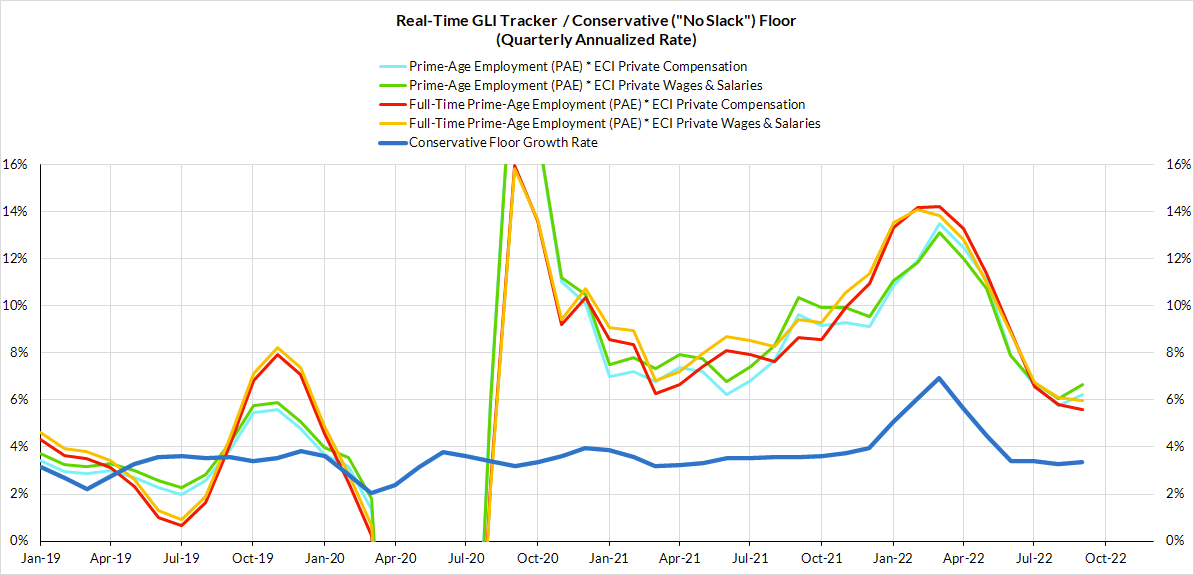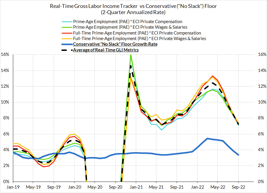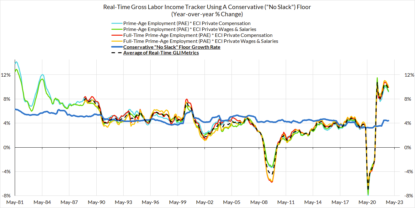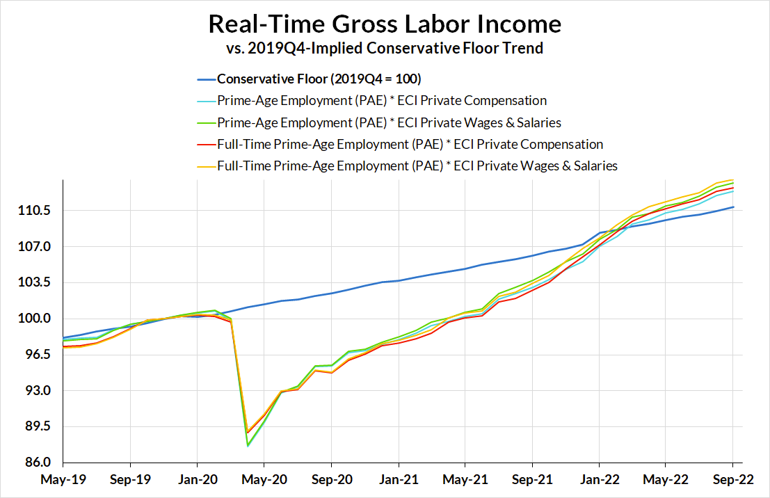 Since the first quarter of this 2022, the recovery in gross labor incomes has been sufficient both in terms of level and growth rate. Relative to when interest rate policy was constrained by the zero lower bound and gross labor income growth fell below its "floor," the trend in our preferred calibrations of real-time gross labor income have more than fully 'caught up.'