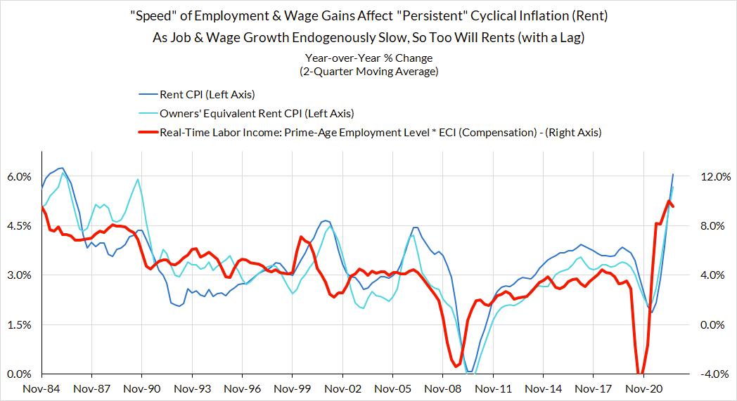We believe the tradeoffs at play are more dynamic than what a static Phillips Curve tends to imply. The more reliable framing is between the speed of employment and wage gains versus the speed of cyclical price gains (most notably with respect to rent). One can accept a slower pace of employment and wage gains—along with its counter-inflationary benefits—without aiming for outright declines in employment rates.