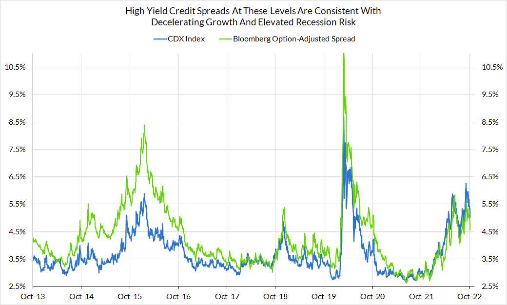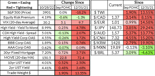 - Financial conditions have largely tightened more than what the 300 basis points of realized Fed hikes this year might otherwise predict.