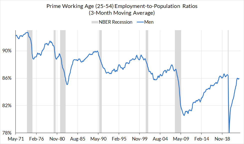 The path-dependence of employment outcomes is especially important to appreciate because the costs of recessionary employment declines are not merely "short run." Prime-age 25-54 employment rates among men are not mean-reverting. They tend to decline sharply in recessions and then subsequently fail to recover to their pre-recessionary peak. With each successive expansion, more of these men, who start out as unemployed, are subsequently classified over time as "not [participating] in the labor force."