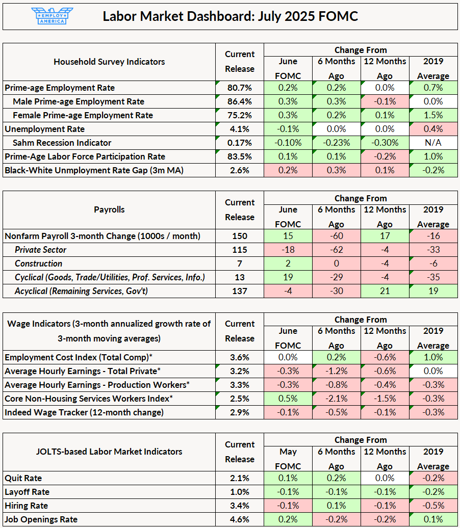 Since the data have not changed much since the last meeting, neither have our stances on the risks to the labor market and how monetary policy should navigate tariff uncertainty. The risk of a slowdown in the next couple of quarters due to trade policy and unbalanced job growth is elevated, even if the headline jobs numbers look good. The difficulty of interpreting inflation under trade policy highlights the shortcomings of inflation targeting, and strengthens the case for nominal targeting. If you haven’t read it, see Skanda Amarnath’s piece on specific language changes the Fed can make to its Consensus Statement to better deal with supply shocks.