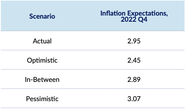 In reality, inflation expectations (measured using the SPF median 10-year CPI forecast) ticked upwards in 2022 Q4 from 2.8% to 2.95%. Given the path of realized CPI inflation, this increase is higher than what the first two scenarios would have forecasted, although not as high as the most pessimistic scenario.