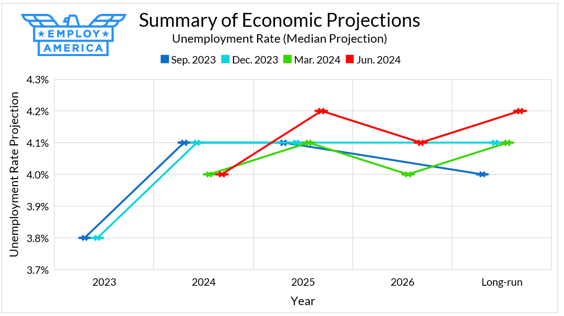 Turning to the long-run unemployment rate, every meeting we’ve seen a handful of members revise their estimate upwards. The median long-run estimate has quietly risen from 4.0% last September, to 4.1% in December and 4.2% in June. One member now even sees the long-run estimate as high as 4.4 - 4.5%. This looks suspiciously like moving the goalposts on full employment—it’s not that the labor market is looking worse, it’s that 4.0% unemployment is too tight! FOMC members have repeatedly written off the recent rise in the unemployment rate as the result of a recent rise in labor supply, particularly from immigration, but there’s unclear why that should change the long-run unemployment rate projection.