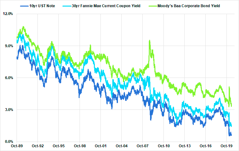 While the federal funds rate directly affects other short-term interest rates, longer-term interest rates are more relevant for driving economic activity. The 30-year fixed rate mortgage is still the predominant financing vehicle for purchasing a home. Weighted average maturity of corporate bond issuance is typically over 15 years.