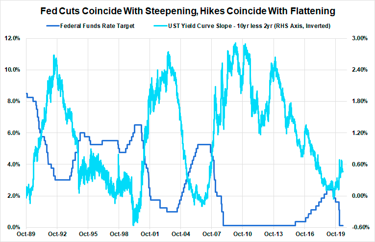 If the Fed signals that its change to the federal funds rate is a temporary measure to be reversed at a later date, then longer-term interest rates are less likely to change. In such instances, the yield curve steepens even when the Fed is cutting short-term interest rates. Likewise, the yield curve flattens (or even inverts) when the Fed raises short-term interest rates. Long-term interest rates can even move in the opposite direction of short-term rates if the market anticipates economic conditions that would motivate the Fed to ultimately reverse course.