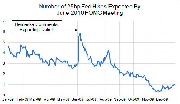 When the Federal Open Market Committee (FOMC) first voted to lower interest rates to the ZLB in December 2008, it signaled a qualitative calendar-based approach to forward guidance, committing to keep rates exceptionally low “for some time.” “For some time” soon morphed to “for an extended period” at the March 2009 FOMC meeting. Yet such guidance was largely meaningless because as soon as riskier assets formed a sustainable trough, markets began anticipating interest rate increases and Chair Bernanke was already willing to start advocate for fiscal tightening!