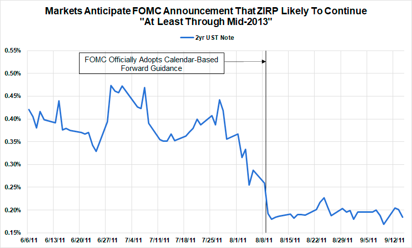 Forward guidance can help to clarify the expected path of short-term interest rates and limit the variance of potential outcomes in the process. If the Fed makes a credible commitment to maintain ZIRP for the next two years, then in the absence of any additional risk premium, 2-year U.S. Treasury Notes should also reflect the same ~0% yield as short-term Treasury Bills.