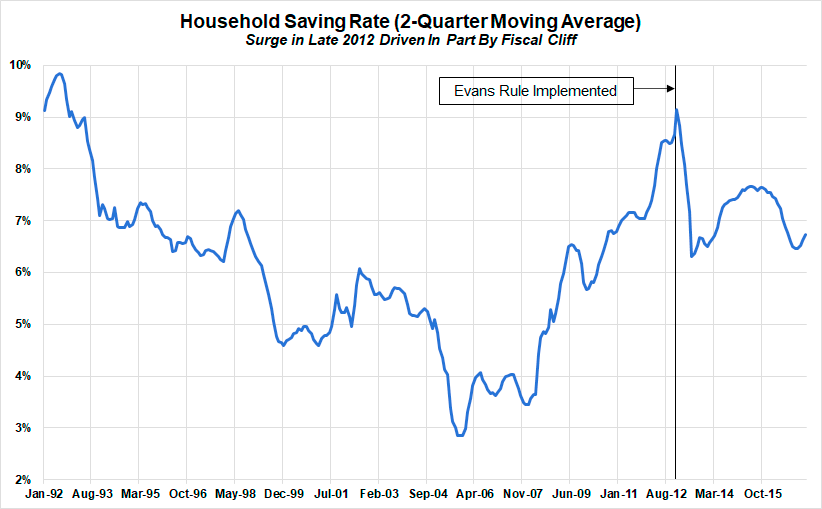 While the Evans Rule was not without its share of flaws, this quantitative state-based approach to forward guidance was a policy success. The commitment to keep interest rates low helped keep the economy afloat, despite headwinds from fiscal policy and household risk aversion. Future posts will discuss some of the flaws with and potential improvements to the Evans Rule that are relevant to our current context.