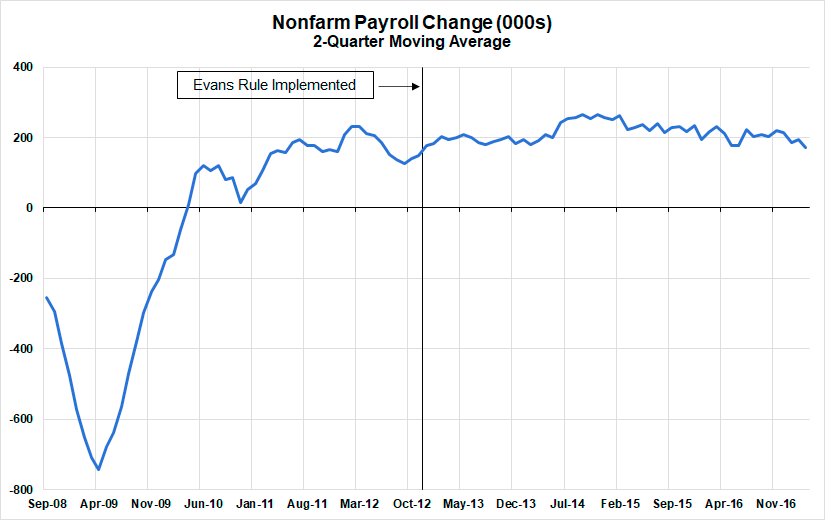 While the Evans Rule did not cause this outcome directly in the way that fiscal expansion could have, the Fed’s unconventional policies still helped to preserve the business cycle expansion amidst significant obstacles.