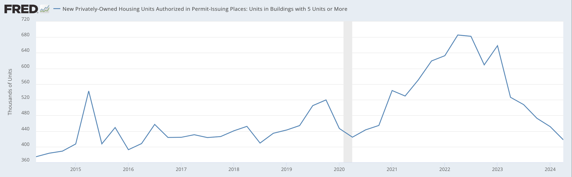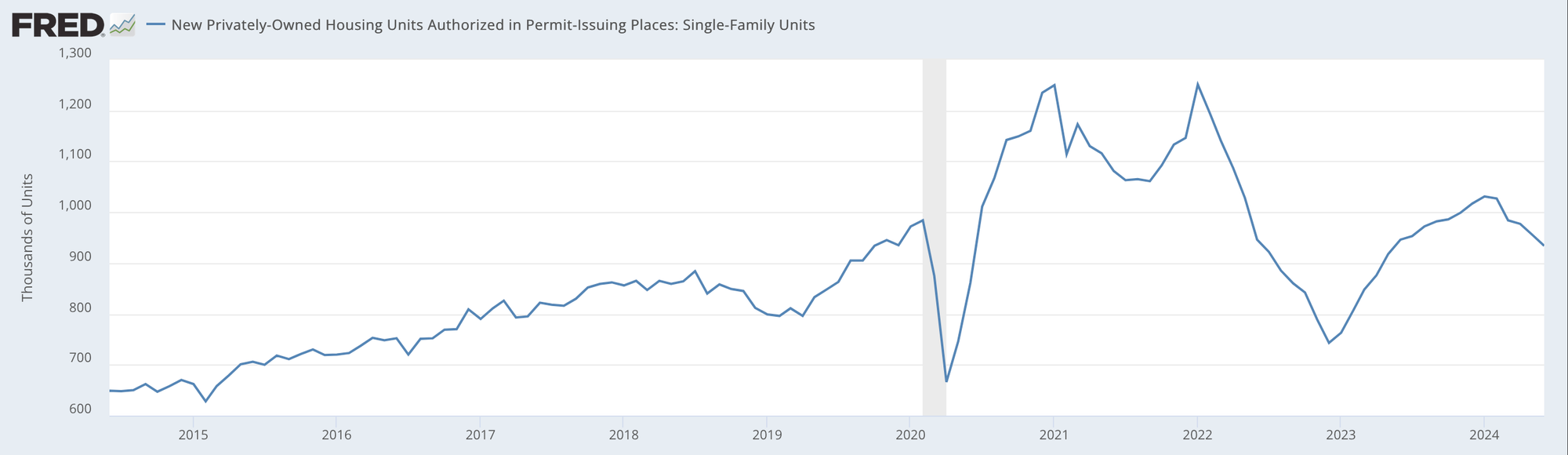 Right now we're seeing reasonably broad slowing in permitting activity tied to housing. Single-family units tend to be the most relevant than multi-family on a dollar-weighted basis, come with lower time-to-build, and are less noisy to observe month-to-month. While there are local spots of strength and weakness, permits are substantially lower than their trajectory and level at the time the Fed began embarking on rate hikes in early 2022.
