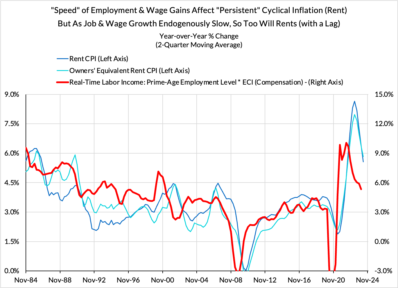 Estimates of market rent for apartments and generally have seen a substantial slowing. Due to methodological lags in the official CPI estimates, we are only now beginning to see this market rent disinflation translate into the Fed's main inflation gauges.