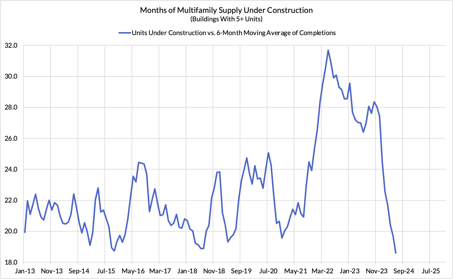 The months of multifamily units' supply under construction has fallen from over 30 months down to just over 18 months. The effect of ever-decreasing permitted units over the past several quarters is not seen in current completions. It's seen in completions 1-3 years later, but seen in lower units under construction today.
