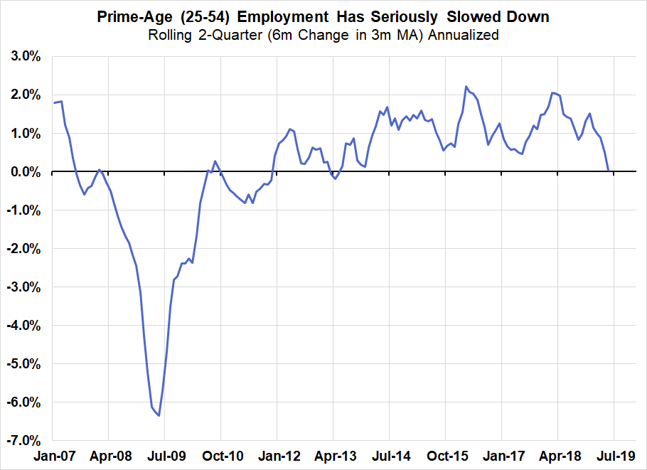 - Prime-age employment trends are signaling elevated slowdown and recession risk. The household survey (CPS) is more volatile than the establishment survey (CES) but is also a better real-time indicator, especially since there is no issue of revisions. What you see is what you get. What we got in April suggested that prime-age employment growth was slowing. The May report only confirmed that we’re now seeing near-contraction in employment for the key set of cohorts that drive labor supply and labor income growth.