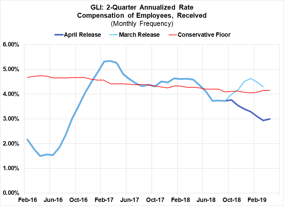 - We learned at the end of May that GLI growth has actually been much slower over the previous 12 months. The “Compensation of Employees, Received” measure in the Personal Income release was previously pointing to a 4% growth rate, close to where we would conservatively set a floor under GLI growth. As of last Friday, year-over-year GLI growth fell sharply from 4.0% to 3.4% in the April release. This observed weakness is in large part a function of wage growth proving to be softer than previously estimated.