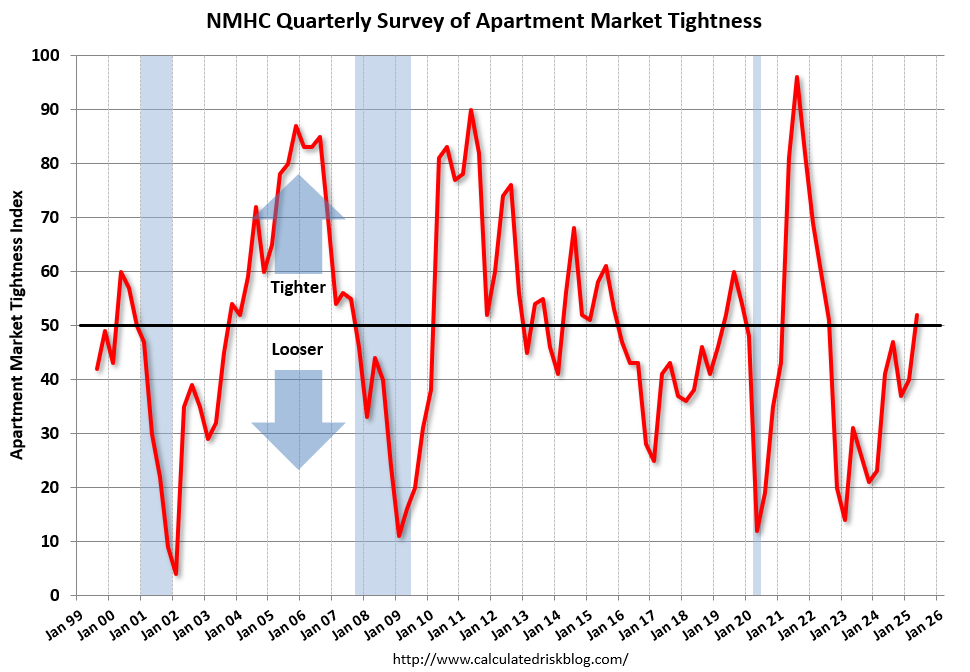 Prior to the threats and enactment of tariffs—a very recent phenomenon—signs of tightening in the rental housing market were swelling. The most recent release of the National Multifamily Housing Council's Quarterly Survey of Apartment Conditions suggests that apartment market tightness, a leading indicator of market rent inflation, is now increasing on balance (chart courtesy of Bill McBride at Calculated Risk). These readings were substantially driven by what transpired prior to the theatrics of Liberation Day.