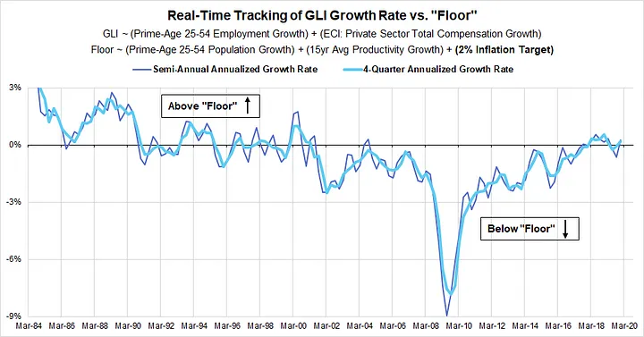 Potential labor supply growth can be conservatively estimated from the data on population growth and demographic structure in the CPS. For a more aggressive definition of the “floor” (not specified here), labor market slack in the form of elevated unemployment and underemployment could also be taken into account. The long-term trend in productivity growth and the Fed’s 2% inflation target can be used for calibrating the other two components of the “floor” for GLI growth.