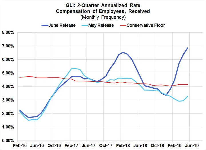 With these two estimates, we can derive a real-time tracker of GLI growth without having to go through the trouble of comparing revised and unrevised estimates of the “Compensation of Employees, Received” series.