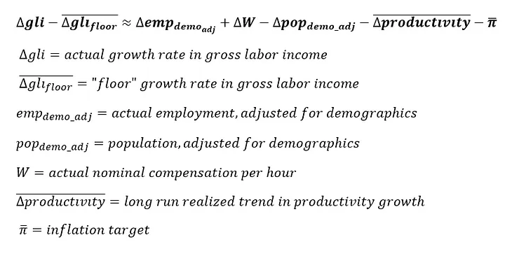 The specified “floor” for gross labor income growth can be conceptually decomposed into (1) an estimate of potential labor supply growth, (2) a baseline target for real wage growth, and (3) a baseline target for the rate of inflation.