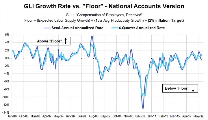 National accounts data, especially GLI, can be revised aggressively, often for several quarters in retrospect. This makes it more difficult to take the most recently released national accounts data at face value. What you see with respect to GDP or GLI growth for a given quarter can look very different in later releases. The Current Population Survey (CPS) and the National Compensation Survey (NCS) can help cut through this problem by giving us estimates of employment and wage growth that are not subject to the same problem of revisions.