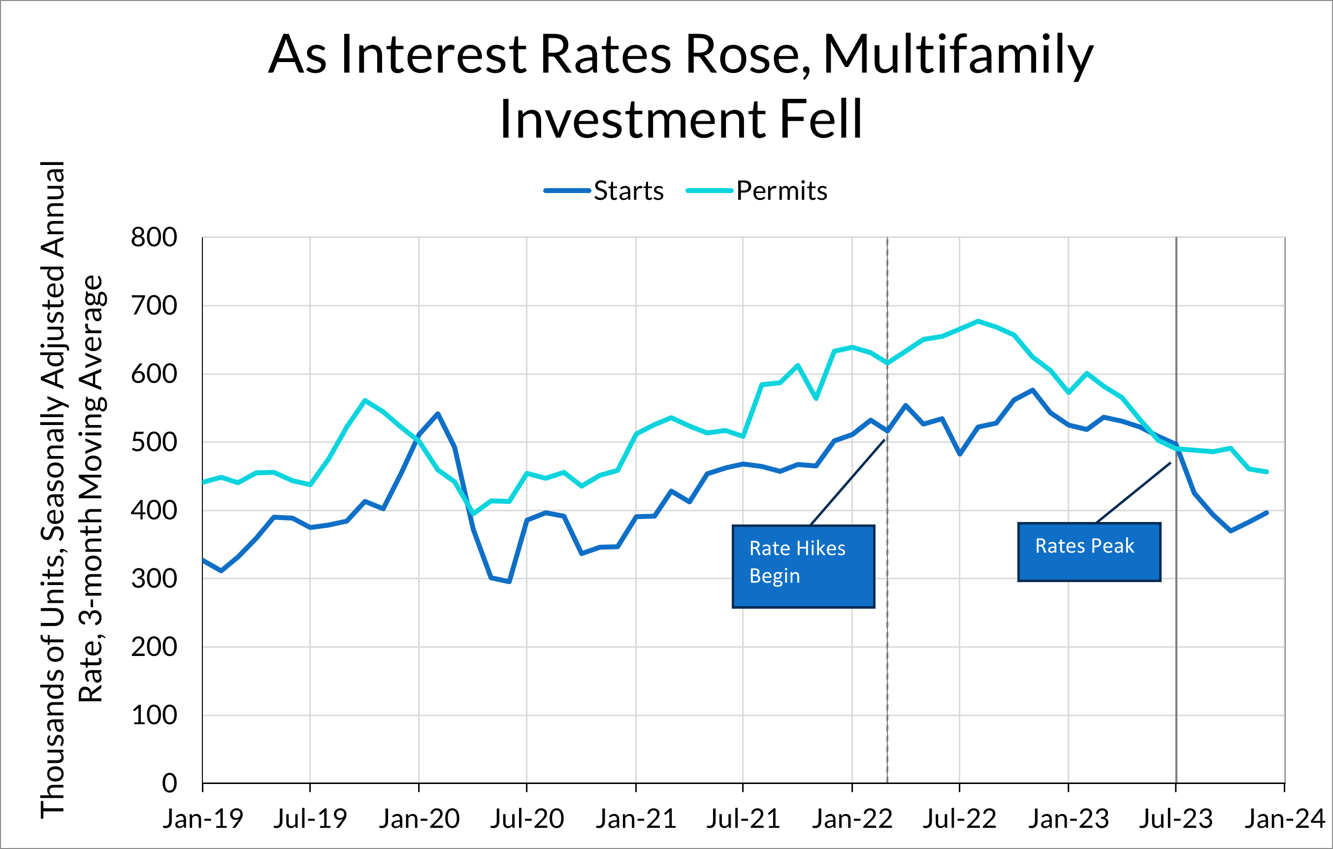 Housing is just as – maybe more – sensitive to financial conditions and regulatory policy as green energy projects. As the Fed raised rates in 2022, new multifamily housing permits and starts have fallen substantially, which bodes poorly for the supply of rental housing in the future. As Mortenson Construction Chairman David Mortenson told Neel Kashkari recently, the current rate environment is holding back construction: