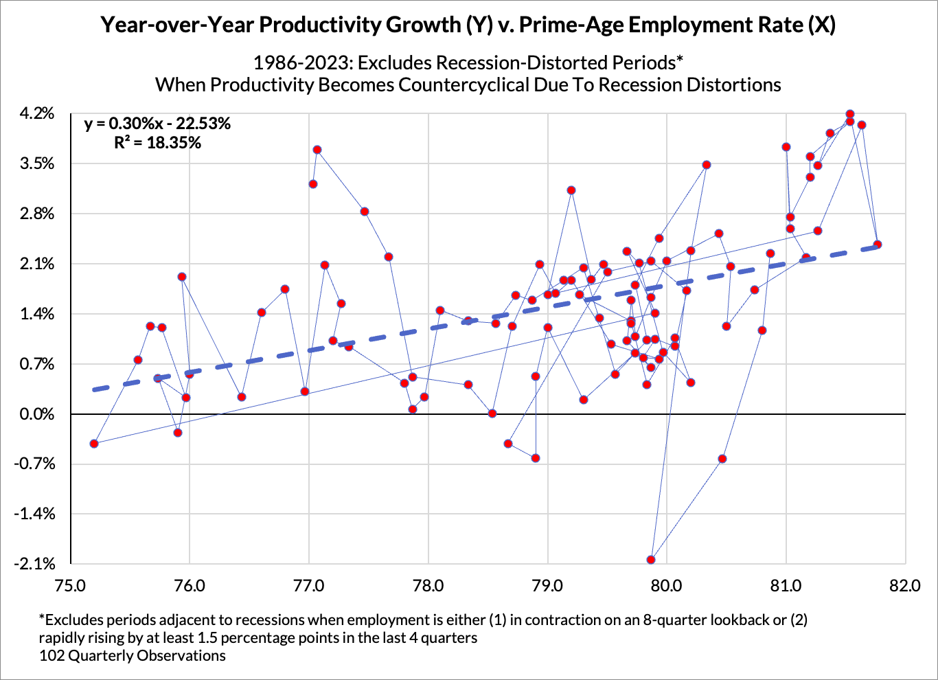 The empirical data on productivity and employment provides some cautious support for the idea that full employment supports productivity. As we mentioned before, productivity is a tricky metric to really understand. When employment goes down quickly, and output takes longer to go down, measured productivity increases quickly and mechanically. During times of rapid changes in employment, such as during recessions or in early parts of recoveries, labor productivity growth is also inadvertently driven by the disproportionate firing or hiring of lower-wage workers. When this dynamic is in play, measured labor productivity growth increases during recessions and falls in the early innings of labor market recovery. Outside those periods, growth in labor productivity correlates positively to the level of employment.