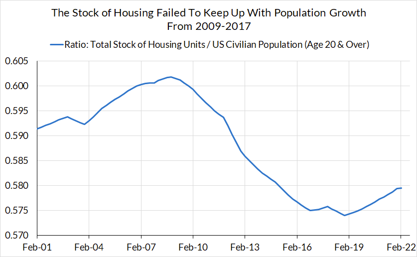 After the 2008 crash, minimal support was provided to housing as an industry, even if banks and certain other mortgage-backed security holders were bailed out. In response, the industry shed workers at an unprecedented rate, as many positioned themselves to weather a long-term downturn in the production of housing. What ensued was an extended period of weak levels of residential fixed investment (a flow) and units completed (a flow), and thus a prolonged loss of housing stock relative to what population levels would otherwise warrant.