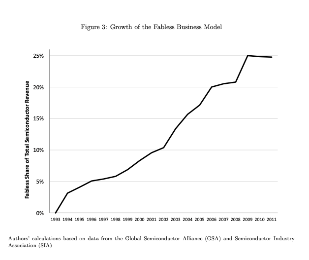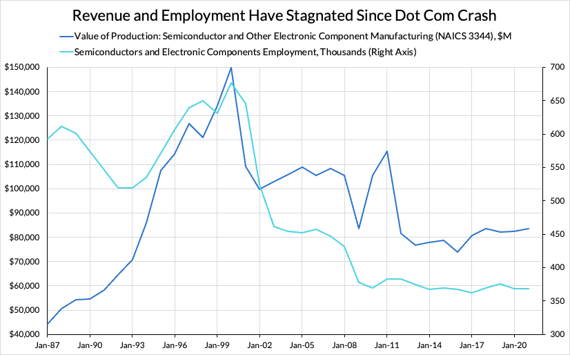As we argued in “A Brief History of Semiconductors: How The US Cut Costs and Lost the Leading Edge,” this loss of manufacturing capacity was in many ways an intentional outcome of a federal policy strategy that emphasized research and development over manufacturing in semiconductors and other high-tech industries. This encouraged the development of capital-light business strategies which required far less domestic investment and hiring.