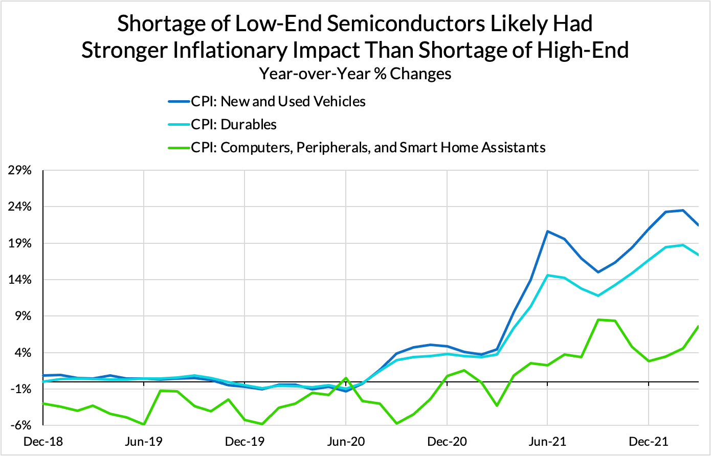 To increase productive capacity requires time and substantial investment, not an increase in sectors that rely on semiconductors for intermediate goods. Prices are liable to remain at elevated levels until one or another of these dynamics is productively addressed.