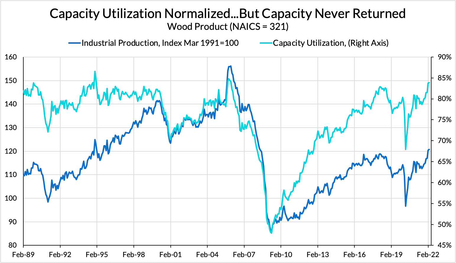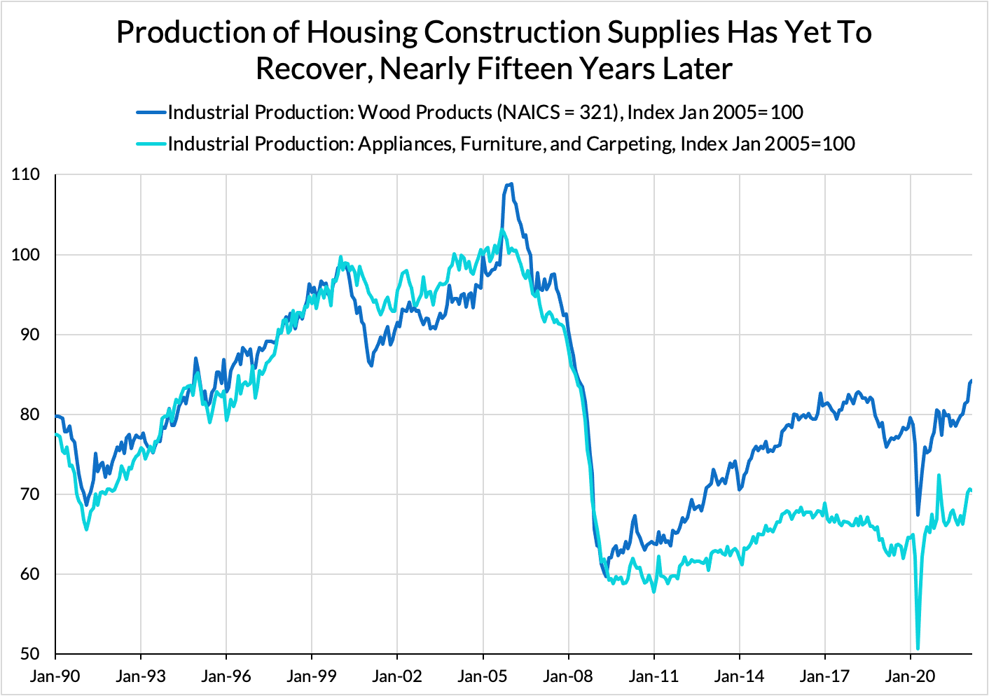 In the half-decade following the 2008 crash, every firm in these industries saw a steep decline in new orders, prompting them to close factories and lay off workers. This was a substantial disruption to the orderly operation of an industry that relies on the steady coordination of thousands of moving parts to produce new houses. We can see this dynamic most clearly in wood products, where the 2008 crash saw a fall in both capacity utilization and output. However, since capacity utilization returned without production returning as strongly, we can safely infer that the industry idled or lost a material amount of capacity. This might take the form of writing off old factories or mills or something subtler, like a rate of investment that remains steady but fails to replace depreciating equipment. Doubtless other sectors faced similar dynamics.
