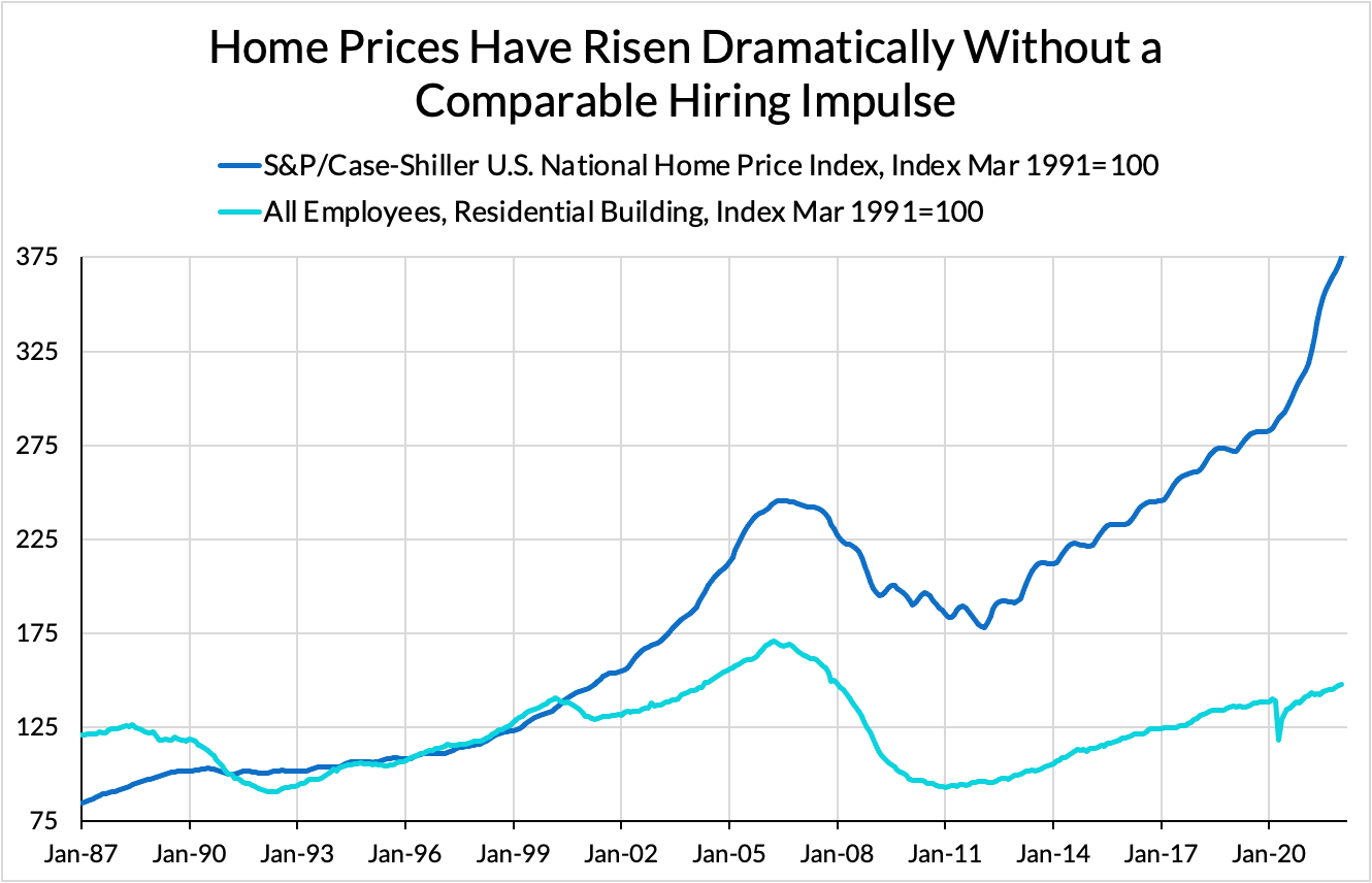 When demand for housing rebounded, as it has since the middle of 2020, homebuilders remained reticent to hire new crews and expand production, expecting to be burned by a subsequent market downturn that would force them to lay off any newly-trained crews.