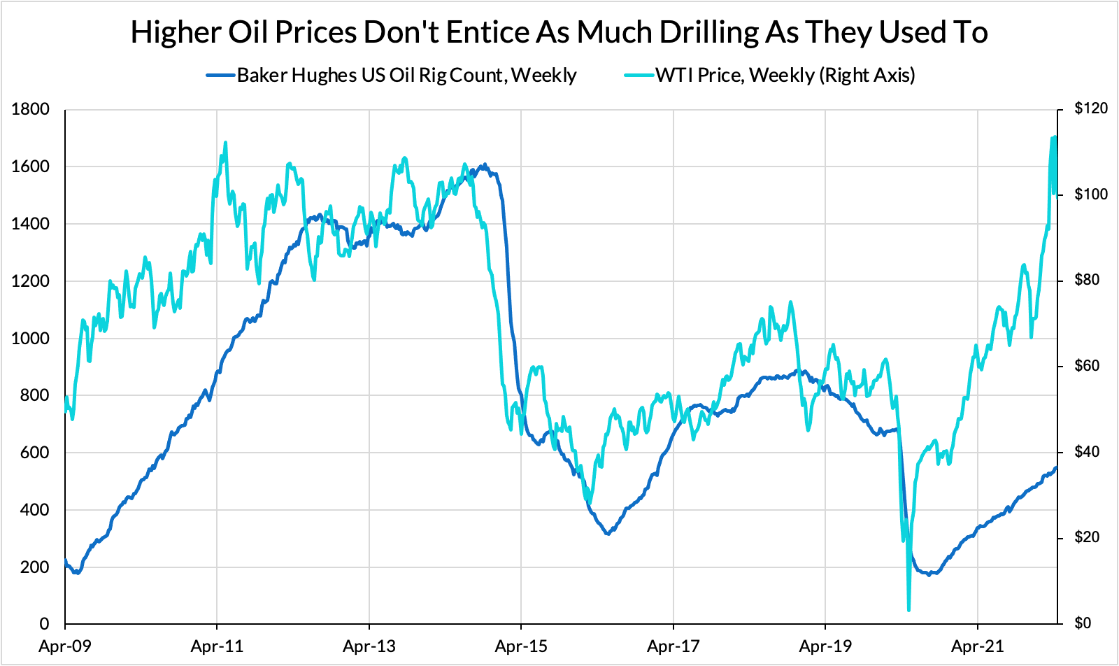 When oil prices rebounded with reopening, creditors and shareholders pressured management to engage in substantial capital discipline, waiting for high prices to validate past investments rather than building out further capacity today merely in anticipation of future demand growth. Even before Russia’s invasion of Ukraine, oil prices were reaching elevated levels, but the invasion and the ongoing loss of Russian supplies has pushed markets to a new degree of market tightness. However, severe market tightness has yet to be accompanied by a substantial acceleration in investment or rig counts.