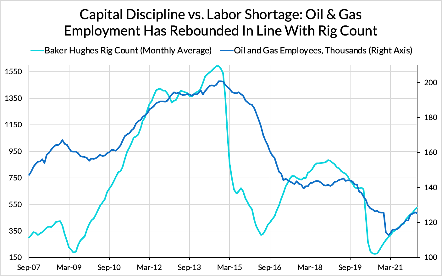 Our points here are not to deny the existence of labor shortages. There is clearly some difficulty in securing oilfield services workers – a notoriously cyclical and physically demanding line of work – but the self-reporting of exploration and production firms (E&Ps) in the latest Dallas Fed Energy Survey clearly indicate that labor is not the proximate constraint to increasing investment. The predominant culprit for weak investment outcomes is “capital discipline,” the unwillingness of investors to finance accelerated capacity expansion. While better availability of oilfield services workers might still marginally help advance investment and future production, employment has generally stepped down with each boom-bust cycle as a byproduct of lower investment. The willingness to invest is not predominantly a function of labor availability.