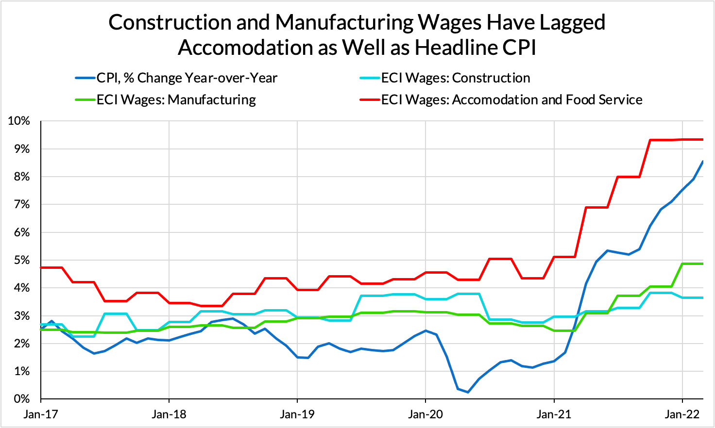 The semiconductor shortage has been a major narrative throughout the pandemic and the recovery, affecting high-tech and low-tech industries alike. One of the biggest knock-on effects from that shortage has been an acute shortage of new automobiles, which has driven extreme price movements in both the new and used vehicle markets. The microchip shortage has also affected the supply of other durable goods, like home appliances. Housing and furnishings both also saw substantial price movements over the pandemic and recovery, with disruptions to lumber supply a major factor in each. A shortage of logistics infrastructure has certainly exacerbated all of these problems and more. As the pandemic prevented the orderly operation of global shipping, supply chains became more and more jammed up, leading to shipping prices and lead times that have been rare since the advent of containerization. In each of these industries, employment has quickly recovered to – or even exceeded – its pre-pandemic trend, yet supply has remained constrained, driving prices higher. In a more academic register, these industries have seen highly elastic labor supply and highly inelastic capital supply since the end of the pandemic recession.
