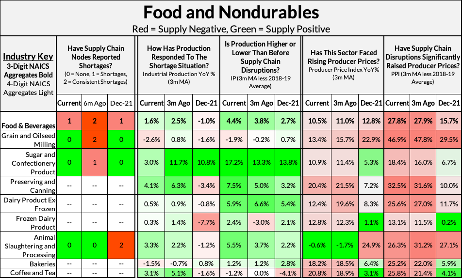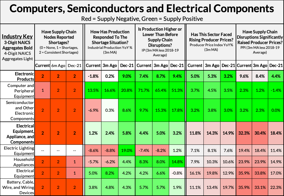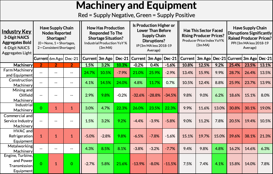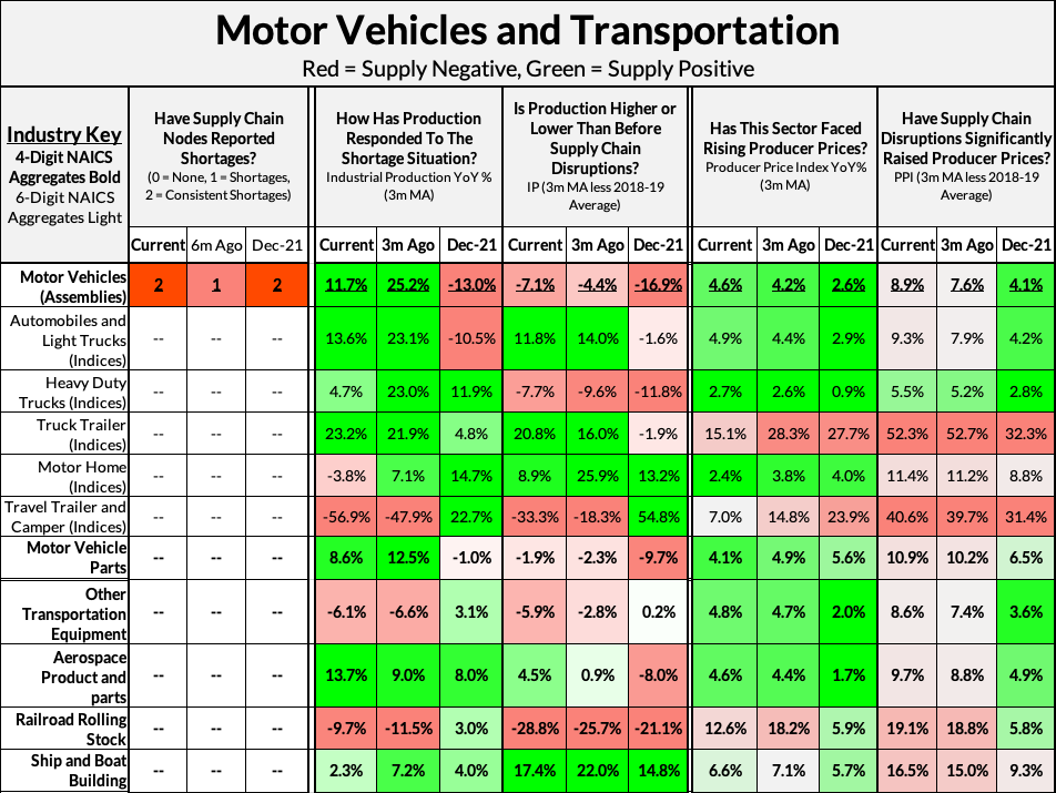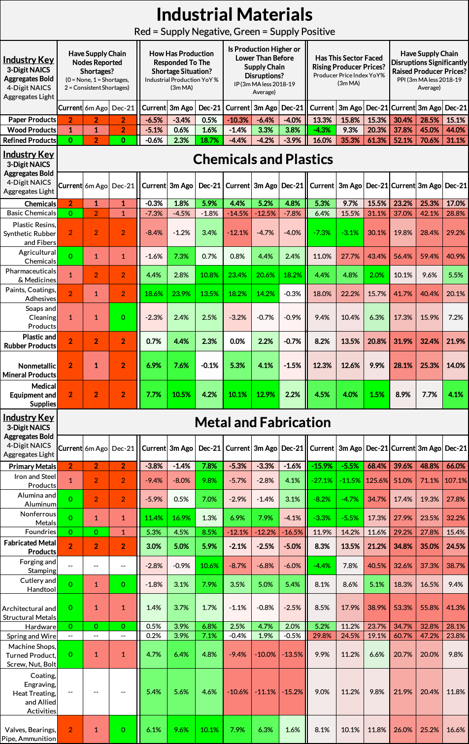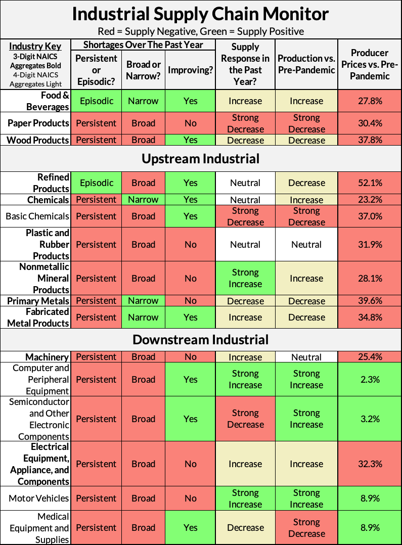 The monitor is broken up into three sections, the first (leftmost) column is a qualitative metric combining the duration and intensity of reported shortages. The center two-column group shows how industrial production has evolved over a range of timelines, while the right-most two-column group shows the same for producer prices.